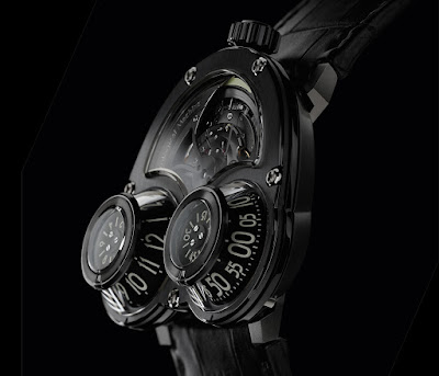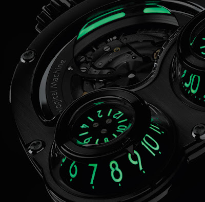 Mit der markanten Avantgarde-Regler-Zeitanzeige ist die Horological Machine Nr. 3 die beliebteste Uhr von MB & F , die seit der Gründung der Marke im Jahr 2005 ein Drittel ihrer Gesamtproduktion umfasst. Basierend auf der MegaWind ist die HM3 MegaWind Final Edition komplett Dunkel, fertig in schwarz und grau, mit grüner Super-Luminova, die nachts lebendig leuchtet